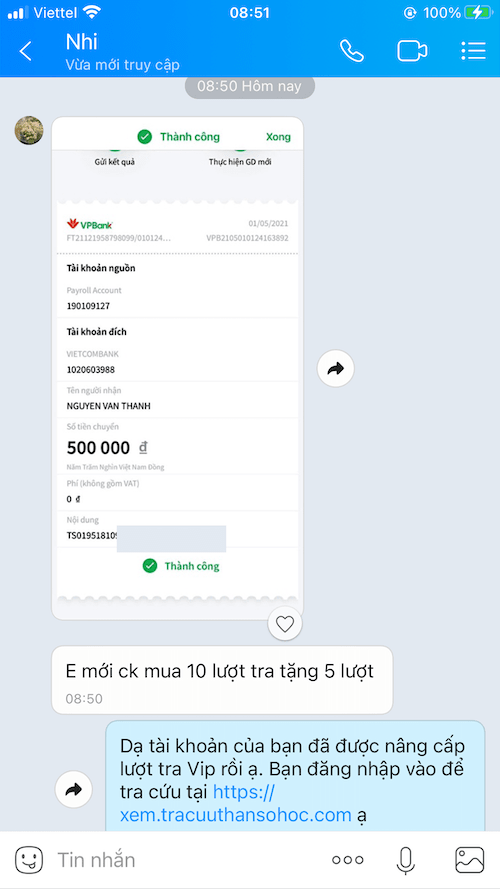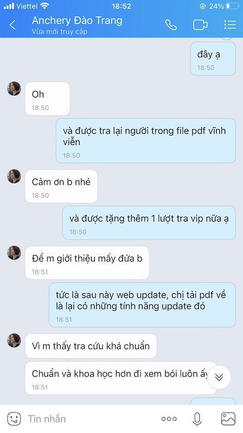 Trả lời: Mỗi lượt Vip được tra cho 1 người và tra lại nhiều lần cũng được. Hệ thống sẽ xuất file pdf và lưu trên web, mỗi khi muốn xem lại bạn có thể tra cứu lại hoặc vào mục "Lịch sử tra cứu" để tải lại file báo cáo là được.
